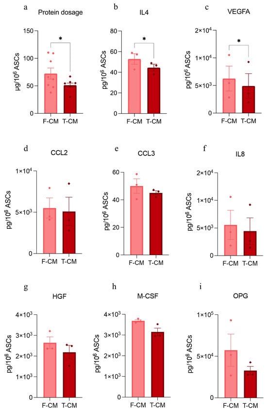Protein content and specific molecules quantification: (a) Bradford protein quantification normalized to 106 donor ASCs. Results are derived from n = 8 independent experiments and are represented as mean ± SEM. (b–i) Bar plots representing levels of eight different effectors in F-CM and T-CM, expressed as pg/106 ASCs. Data are derived from n = 3 samples and are represented as mean ± SEM. * p < 0.05.
