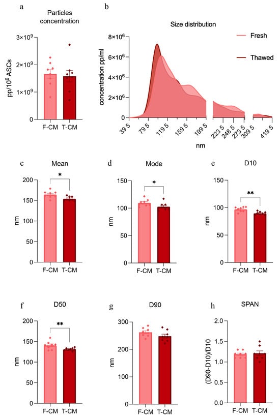 Particles concentration and distribution metrics in F-CM and T-CM: (a) Total particle concentration measured using a nanoparticle tracking assay (NTA) and normalized to 106 ASCs. (b) NTA mean curves that show particle (pp) distribution and major variations between F-CM and T-CM. (c,d) Bar plots representing the numerical values obtained from NTA (mean–mode). (e–g) Bar plots representing D10-D50-D90 diameters obtained with NTA. (h) Span index was calculated as (D90–D10)/D50. A span greater than 1 indicates a heterogenous sample. Data are derived from eight independent experiments (n = 8) and are represented as mean ± SEM. * p < 0.05, ** p < 0.01.