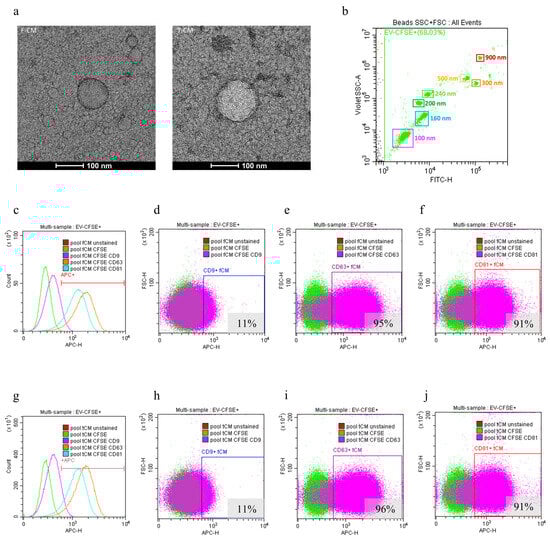 EV characterization using pooled F-CM and T-CM: (a) Representative images of EVs in F-CM and T-CM. Diluted 1:5 samples were prepared for TEM analysis using negative staining. Images were acquired at 57k× magnification. (b) Calibration for dimensional gating and debris exclusion was made using FITC+ beads with known sizes (corresponding diameters of 100, 160, 200, 240, 300, 500, and 900 nm). (c) F-CM CFSE+ vesicles that showed positivity for CD9 (d), CD63 (e), and CD81 (f). (g–j) T-CM following the same pattern as described above.