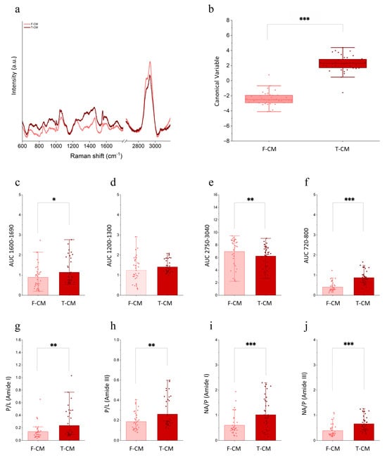 Biochemical characterization of F–CM and T–CM using Raman spectroscopy: (a) Average Raman spectra of n = 4 independently analyzed F-CM and T-CM. Average spectra are obtained from a minimum of 10 spectra per sample. (b) Box plot of the canonical variable scores obtained after PCA and LDA. (c–f) Bar plot of the spectral area under the curve (AUC) in the amide I range (1600–1690 cm−1), the amide III range (1200–1300 cm−1), the lipid associated range (2750–3040 cm−1), and the nucleic acids range (720–800 cm−1). (g,h) Bar plot of the protein to lipid ratio (P/L) obtained for F-CM and T–CM from the AUC of amide I and amide III divided based on lipid range. (i,j) Bar plots of the ratios of nucleic acids to both amide I and amide III, derived from the respective AUC ratio. * p < 0.05, ** p < 0.01, and *** p < 0.001.