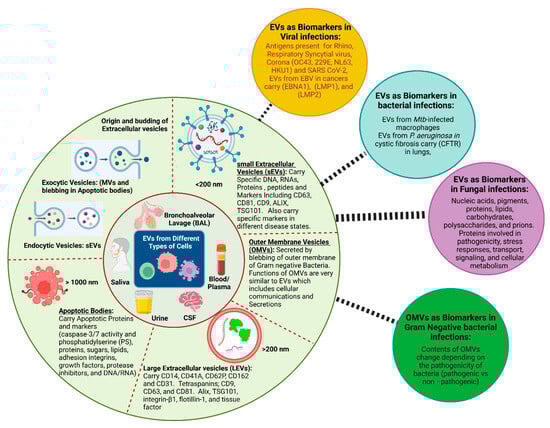 Extracellular vesicles: sources, origin, and biomarkers in infectious diseases (Created with BioRender.com).