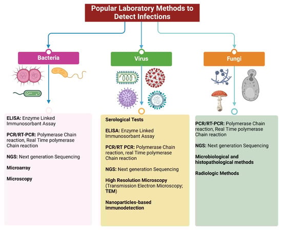 Molecular biology-based laboratory methods to detect infections: bacterial, viral, or fungal (Created with BioRender.com).