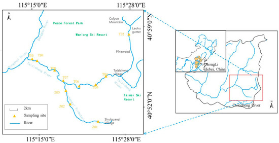 Taizicheng River, located in the heart of the Chongli District in Zhangjiakou, China, is a mountain river of significant importance, particularly as a crucial part of the 2022 Winter Olympics’ core zone (Figure 1). The river originates from densely forested mountains, with its basin surrounded by mountains with a vegetation coverage exceeding 65%. The dominant forest types in the region are Betula platyphylla Suk and Larix thibetica. In the upper reaches of the river, the dense vegetation near the riverbanks provides shade, lowering the water temperature in the adjacent areas. The roots of the riverside plants offer attachment points for zooplankton. The river spans a length of 30.50 km, with an average width of approximately 2.00 m. The general depth is less than 1.00 m, and river transparency ranges from 0.01 to 0.70 m (Table S1). Such a river channel and water depth contribute to the formation of turbulent flow, enhancing the mixing of water, nutrients, and oxygen. The river, with an altitude from 1180 m to 1910 m and rapid flow, lies in a region of typical continental monsoon climate: cool, humid summers and long, cold winters. The average temperature in summer is around 19 °C and averages −12 °C in winter. The river’s flow velocity ranges from 0.06 to 1.96 m/s. The seasonal changes in precipitation patterns directly affect the stream’s discharge. During the rainy season, the stream has a larger water volume and faster flow. In winter, when the area experiences freezing and snowfall, as precipitation turns into snow, the mountain runoff decreases significantly, causing the river’s water volume to decline. The cold temperature slows down the water flow, thus affecting the distribution and movement of zooplankton. The freezing and snowfall period in the region lasts from November to March. The area receives approximately 500 mm of rainfall annually. Mountain runoff following precipitation is the primary water source for the river. In the upper reaches of the Taizicheng River, the water flow is rapid, and the substrate mainly consists of gravel and organic debris sediments. In the middle and lower reaches, the flow rate is relatively slow, and the substrate is mainly sand or silt sediments. The river is abundant in nutrients such as nitrogen and phosphorus, and the concentrations of these nutrients display substantial seasonal fluctuations.