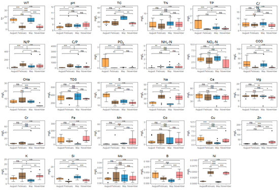 The water quality indicators of Taizicheng River in four months were summarized (Figure 2). Overall, the annual water temperature variation range of the Taizicheng River was −0.60~21.10 °C (p < 0.001), the water pH in the Taizaicheng River was alkaline, there was no significant difference in TDS and pH among the months, while the concentration of Chla and COD showed significant month differences, with the concentration being lower in February (p < 0.001) (Figure 2). TP and PO4 concentrations were similar and varied between 0 and 1.97 mg/L. The TP, PO4, and S concentrations in August were significantly higher than those of other seasons (p < 0.001) (Figure 2). Significant differences were observed among the trace elements Na, Fe, Cu, Zn, Si, B, and Ni. The Na, K, and Ni concentrations in February were significantly higher (p < 0.001), while Fe, Cu, and B concentrations in August were significantly higher (p < 0.001).