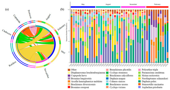 Non-metric multidimensional scaling (NMDS) was performed to explore the composition of zooplankton taxa across the four months. Significant segregations between February and the other three months’ sampling groups were found for zooplankton (Figure 4a). This indicated that the zooplankton community structure in February was significantly different from those in May, August, and November. The distribution range of samples in the February group was large, indicating that the community structure of samples in the February group was very different. The samples of the May group, August group, and November group overlapped to some extent, indicating that the three groups had some similarities in community composition. Regarding the alpha diversity of zooplankton taxa (Figure 4b,c and Figure S1), the observed richness (17.09 ± 2.59) and Shannon diversity (1.86 ± 0.37) were significantly higher in May than in the other three months, and the observed was the lowest in February (12.08 ± 3.29), whereas evenness was not significantly different in the four months (t-test, p < 0.001).