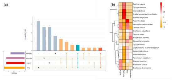 (a) Upset diagram depicting the number of shared and unique species in the stream during the four months and (b) distribution of the zooplankton species among the four months.
