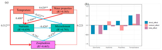 The separate models based on temperature (Figure 8a) were built to explore the influences of environmental variables on the zooplankton diversities, and the specific effects were exhibited in Figure 8b. Our partial least squares-path model explained 46.50% of the variation in zooplankton through temperature, water properties, nutrients, and trace elements (Figure 8). Temperature was the most significant factor affecting the zooplankton diversity, and the direct effect was 0.51 (p < 0.01). Temperature significantly affected water properties, trace elements, and nutrients, with a direct effect of 0.62 (p < 0.01), −0.62 (p < 0.01), and 0.40 (p < 0.01), respectively. Furthermore, both trace elements and nutrients had a direct negative effect on zooplankton diversities, with −0.48 (p < 0.01) and −0.26 (p < 0.01), respectively. More importantly, temperature also exhibited indirect and negative effects on zooplankton diversities through altering trace elements.