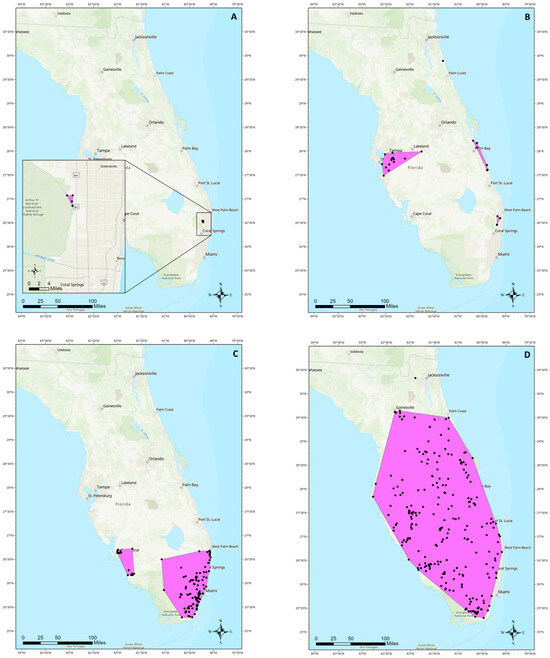 Maps with established species distribution examples and polygons used for calculating spread areas. (A) croaking gourami Trichopsis vittata, a slow-spreading, highly localized population. (B) green swordtail Xiphophorus hellerii, a series of slow spreading, localized, or extirpated populations across the state. (C) butterfly peacock bass Cichla ocellaris, a fast-spreading but thermally limited species. (D) brown hoplo Hoplosternum littorale, a species which has quickly spread throughout much of the state. Black points represent collection locations for each species.
