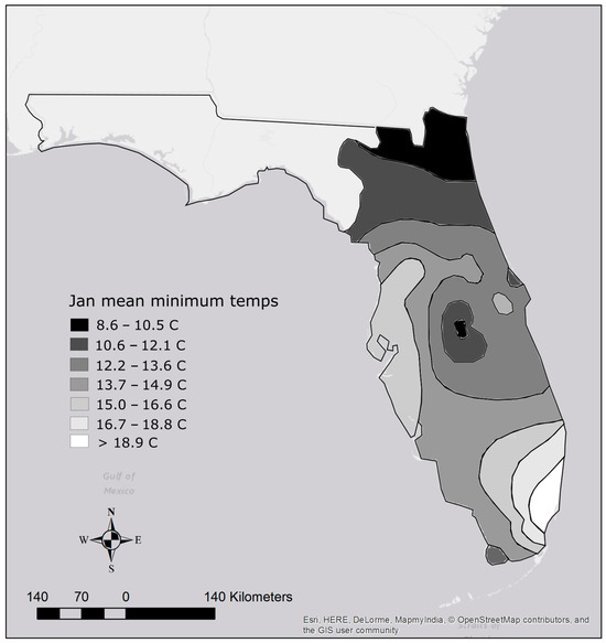 Thermal tolerance affects the ability of an organism to spread. Therefore, using the previous methodology, some species appear to be slow spreaders, but only because they are thermally limited, and their potential range is small. From a state-wide risk perspective, this may not be important; however, from a biological perspective, this is an issue that requires attention. To address this deficiency, we first determined each species’ potential range based on their lower lethal temperature. A map was constructed by Lawson et al. [28] using January mean minimum water temperatures to interpolate the thermal minima of Florida’s regions. Polygons were constructed according to the temperature ranges presented in Lawson et al. [28] and the area of each polygon was calculated (Figure 2). For each species, the area of the polygons with a minimum temperature higher than its lower lethal were summed to obtain its potential range. We then took each species’ previously calculated area occupied and divided it by their potential range in peninsular Florida to obtain a percentage, then divided that percentage by the number of years since introduction. This resulted in the percent potential range occupied per year since introduction (Table 1).