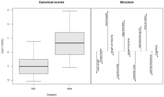 Canonical discriminant function analysis of life history traits. Slow or fast labels in the first pane (Category) are based on the chosen cutoff value of 0.16 (see text). Directionality of variables in the second pane show the combination of traits that best differentiate fast-spreading species from slow-spreading species.