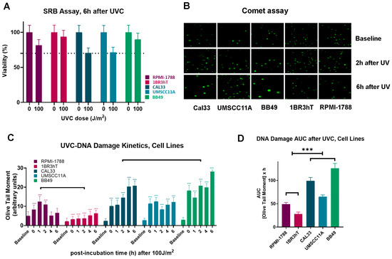 UVC-induced DNA damage repair in cell lines. (A) UVC-induced cytotoxicity and cell proliferation at 6 h. (B) Representative comet assay images of cell lines at baseline, 2 h and 6 h after UVC-treatment. (C) The UVC-induced DNA lesions kinetics measured by comet assay and (D) total amounts of DNA damage expressed as AUC. Error bars represent SD; *** p < 0.001.