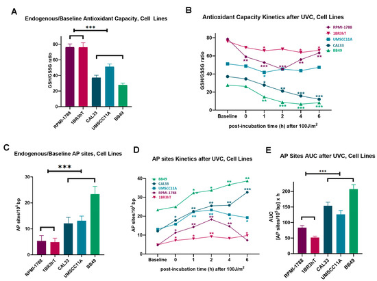 Next, we evaluated the critical intracellular factors of oxidative stress and AP sites that are involved in cancer onset and progression, as well as in cancer therapy. All HNSCC cell lines showed significantly higher levels of endogenous/baseline and UVC-induced oxidative stress than normal cells, evidenced by the reduced GSH/GSSG ratio in HNSCC cells (p < 0.05; Figure 2A,B). In line with these data, higher levels of both endogenous/baseline and UVC-induced apurinic/apyrimidinic sites (all p < 0.05; Figure 2C,D) were observed in HNSCC cell lines when compared to normal cells, resulting in significantly increased accumulation of UVC-induced AP sites in malignant cells (p < 0.001; Figure 2E).