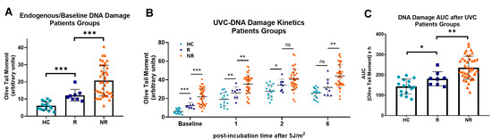 Next, following the stratification of HNSCC patients into responders (n = 8; CR and PR) and non-responders (n = 41; SD and PD), we tested the hypothesis that DNA damage-related parameters are involved in the response to nivolumab therapy. We found that the endogenous/baseline DNA damage was in the order HC < responders < non-responders, suggesting that non-responder HNSCC patients are characterized by higher levels of DNA damage than responders (all p < 0.001; Figure 4A). Moreover, the DNA repair capacity of PBMCs was analyzed after 5 J/m2 ultraviolet irradiation. Decreased DNA repair capacity was found in PBMCs derived from non-responders than PBMCs from responders (Figure 4B), leading to increased UVC-induced DNA damage burden in samples from non-responder patients (p < 0.05; Figure 4C).