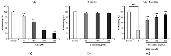 Effects of H2O2 (a), C. asiatica extract (b), and H2O2 + C. asiatica extract (c) on cell viability. Each value represents mean ± the standard error of mean (SEM) (n = 6). ** p < 0.01, and *** p < 0.001 vs. 300 µM H2O2 (one-way analysis of variance + Tukey’s multiple test).