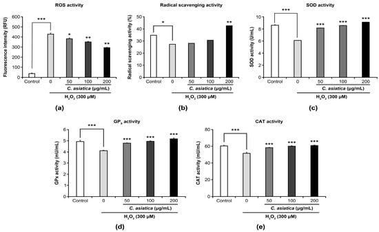 Ameliorative effects of C. asiatica extract on H2O2-induced changes in oxidative stress marker activities: (a) reactive oxygen species (ROS), (b) radical scavenging, (c) superoxide dismutase (SOD), (d) glutathione peroxidase (GPX), and (e) catalase activity. Each value represents mean ± SEM (n = 3). * p < 0.05, ** p < 0.01, and *** p < 0.001 vs. 300 µM-H2O2 (one-way analysis of variance + Tukey’s multiple test).