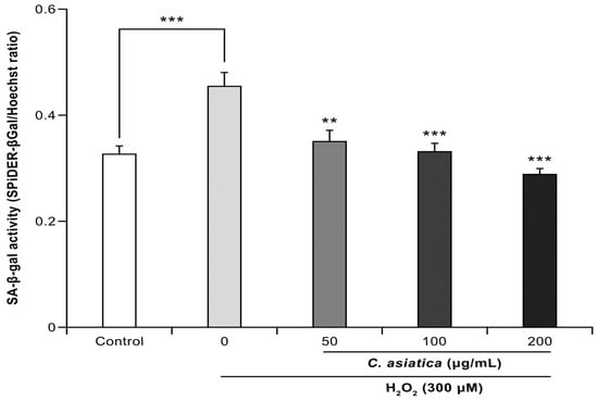 The ameliorative effect of C. asiatica extract on H2O2-induced increase in SA-β-gal activity, a marker of cellular senescence. Each value represents the mean ± the SEM (n = 6). ** p < 0.01, and *** p < 0.001 vs. 300 µM H2O2 (one-way analysis of variance + Tukey’s multiple test).