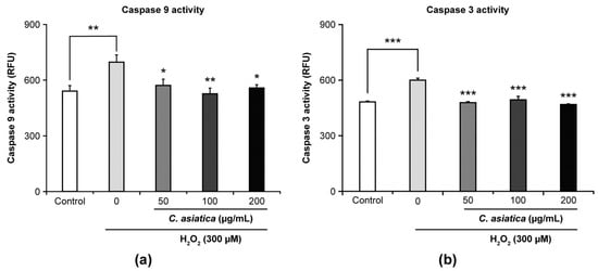 Ameliorative effects of C. asiatica extract on H2O2-induced increase in apoptotic marker activity: (a) caspase-9 and (b) caspase-3. Each value represents mean ± SEM (n = 6). * p < 0.05, ** p < 0.01, and *** p < 0.001 vs. 300 µM H2O2 (one-way analysis of variance + Tukey’s multiple test).
