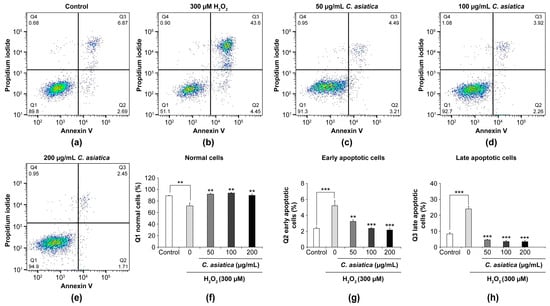 The ameliorative effects of C. asiatica extract on H2O2-induced apoptotic cells. Panels (a–e) show the flow cytometry of the four-quadrant Annexin V–PI scattergrams in controls, H2O2 (300 µM)-treated, and C. asiatica (50–200 µg/mL) + H2O2 combination-treated cells. Quadrants Q1, Q2, Q3, and Q4 represent normal (Annexin V−/PI−), early apoptotic (Annexin V⁺/PI−), late apoptotic (Annexin V⁺/PI⁺), and necrotic (Annexin V−/PI⁺) cell populations. Panels (f–h) show the quantitative data comparing the percentages of normal, early, and late apoptotic cell populations among the groups. Each value represents the mean ± the SEM (n = 3). ** p < 0.01, and *** p < 0.001 vs. 300 µM H2O2 (one-way analysis of variance + Tukey’s multiple test).