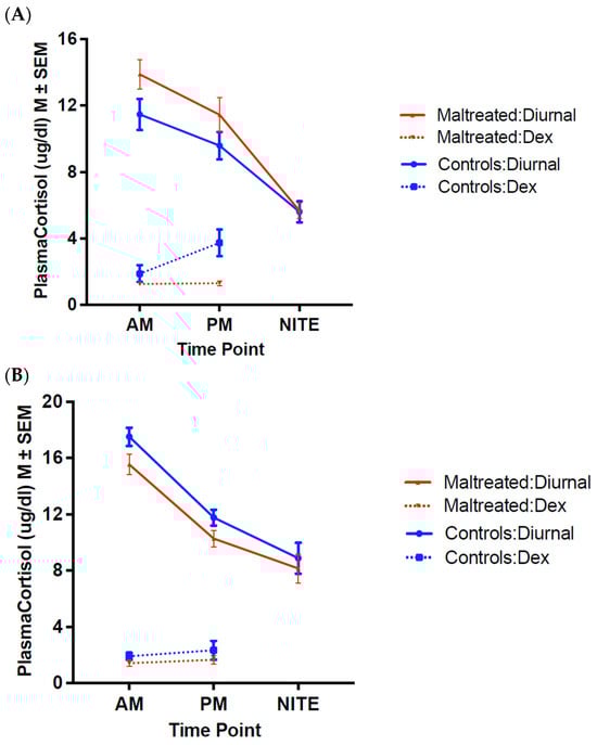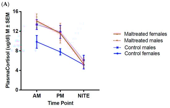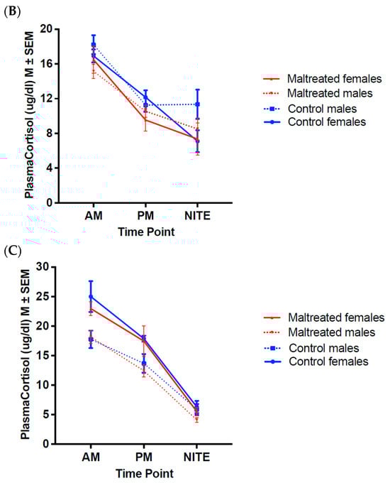 The goal of the present study [49] was to examine the long-term maturational impact of infant MALT on the HPA axis function of cross-fostered animals, beyond the first six months of life, after MALT stops and into the juvenile and post-pubertal, late adolescent years. We were also interested in examining sex differences. In humans, there is gender bias in psychopathology prevalence, with women being at a greater risk for stress-related disorders such as depression and anxiety disorders [50], which are particularly likely to emerge during adolescence [51]. While psychosocial factors may also be at play, extensive cross-talk between the hypothalamic–pituitary–gonadal (HPG) and HPA axes likely constitute a physiological component of this disparity. Surprisingly, there is a scarcity of literature on sex-specific differences in circadian HPA axis rhythmicity in the transition from the juvenile pre-pubertal to post-pubertal adolescent periods [52,53], let alone on the interaction with early life experience [53,54].