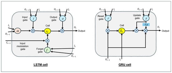 Figure 3. LSTM and GRU cell structures. (left) LTSM; (right) GRU. - GRU is another widely used RNN architecture. Similar to LSTM, GRU exploits information from the past. GRU receives temporal information only from the output at time ; unlike LSTM, it does not require hidden states. GRU has two inputs ( and ) and one output (), and it contains two gates: the reset gate r and the update gate z [11]. As shown in Figure 3, the input and output mapping can be described as follows: