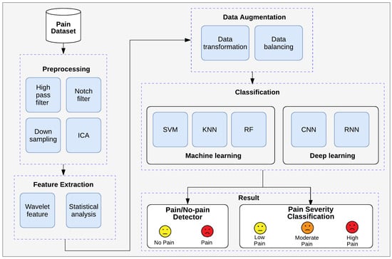 Data augmentation techniques, including the synthetic minority oversampling technique (SMOTE), solve class imbalance problems, guaranteeing more representative datasets for model training. Finally, the classification stage employs both ML and DL approaches to train models capable of accurately classifying pain severity based on the extracted features.