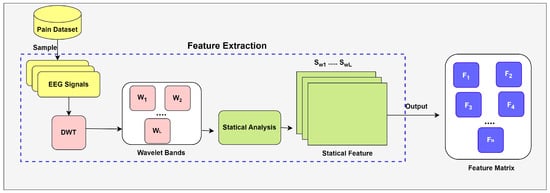 This section explains the feature extraction process, which contributes to the extraction of informative patterns from EEG signals. Based on the literature review, the importance of leveraging time–frequency characteristics for pain detection in EEG signals has been established [18,19,20,21]. This study employed wavelet transform as a feature extraction technique due to its effectiveness in identifying pain-related patterns within the time–frequency domain of EEG signals [22]. Wavelet transform decomposes EEG data into distinct frequency components using discrete wavelet transform (DWT), enabling separate analysis of each frequency band and identification of pain-related features within these bands. In particular, we focus on EEG patterns such as increased alpha or beta activity, which have been correlated with pain perception in previous studies.