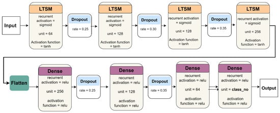 - LSTM controls data flow using four gates: the input gate, output gate, forget gate, and input modulation gate. The LSTM cell receives three inputs and exports two outputs, as illustrated in Figure 3. The inputs include the hidden state of the previous time (), the output of the previous time (), and the input at the current time (). The output of the cell serves as the input to the next cell, which is the hidden state and output of the current time [11].