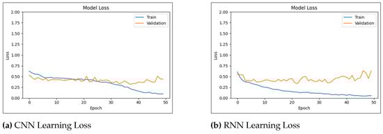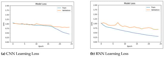 Figure 10 shows the learning curves of the CNN and RNN models over 25 epochs. The learning curves visualize the improvement in model performance with exposure to training data. These curves are essential for evaluating model convergence and identifying potential problems associated with overfitting or underfitting.