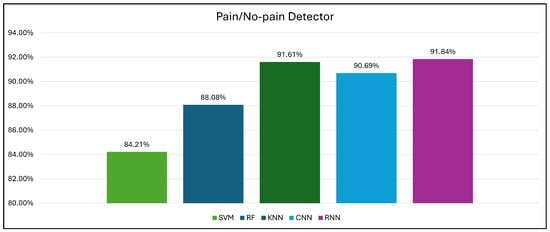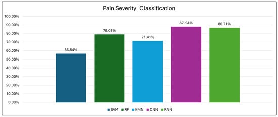 The outcomes of this study illustrate the effectiveness of the DL CNN and RNN models in contrast to the conventional ML classifiers SVM, KNN, and RF for both pain detection and severity classification tasks. This advantage is attributed to the inherent ability of DL models to extract complex representations and underlying patterns from data. This ability translates into superior performance and accuracy when predicting high- and low-pain levels.