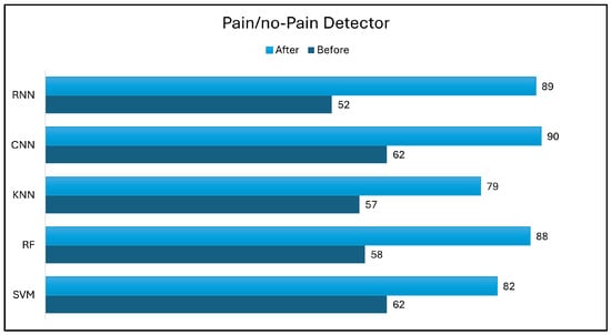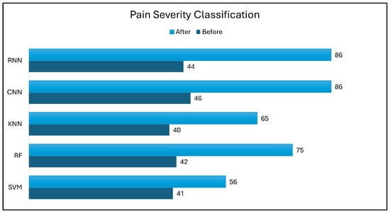 Prior to data augmentation, all classifiers exhibited modest accuracy, with the CNN model achieving the highest performance at 62% and 46% in pain/no-pain detection and pain severity classification, respectively. However, these accuracy levels were relatively low compared to the performance of the other pain detection methods.