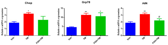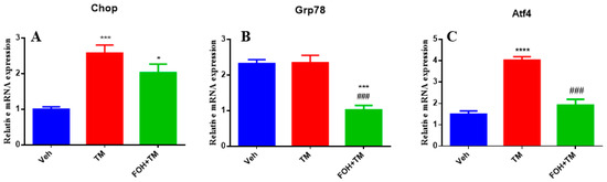 The time course of mRNA expression for these ER stress markers in response to TM treatment was examined. After 6 h of TM exposure, a significant increase in the mRNA levels of Grp78, Chop, and Atf4 was observed compared to the control group (treated with DMSO). Treatment with FOH at 25 µM significantly reduced the mRNA expression of Grp78 and Atf4, indicating a mitigation of ER stress in hepatocytes. However, the expression of Chop remained relatively unaffected by FOH treatment.