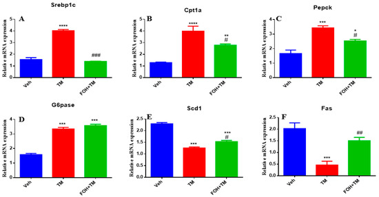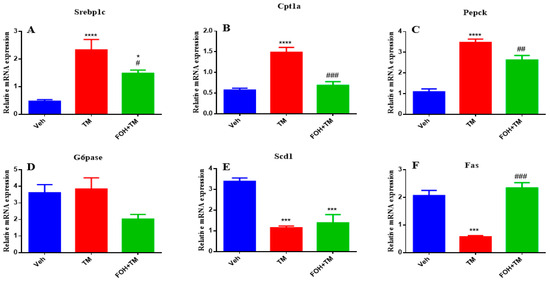 Ameliorative effect of farnesol on tunicamycin-induced changes in the relative expression of hepatic energy homeostasis-related genes. (A) Gene expression of Srebp1c; (B) Gene expression of Cpt1a; (C) Gene expression of Pepck; (D) Gene expression of G6pase; (E) Gene expression of Scd1; (F) Gene expression of Fas in primary hepatocytes. Values represent the mean ± SEM from three independent biological replicates. Veh: control (vehicle); TM: tunicamycin; FOH+TM: farnesol plus tunicamycin. * p < 0.05, ** p < 0.01, *** p < 0.001, **** p < 0.0001 vs. Veh; # p < 0.05, ## p < 0.01, ### p < 0.001 vs. TM.