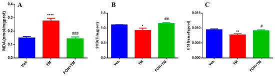 Protective effect of farnesol against tunicamycin-induced oxidative stress in the liver. (A) MDA levels; (B) SOD activity; (C) GSH levels. Values represent the mean ± SEM from eight biological replicates per group. Statistical significance was determined using one-way ANOVA followed by Tukey’s multiple comparison test. Veh: Control (vehicle); TM: Tunicamycin; FOH+TM: Farnesol plus tunicamycin. * p < 0.05, ** p < 0.01, **** p < 0.0001 vs. Veh; # p < 0.05, ## p < 0.01, ### p < 0.001 vs. TM.
