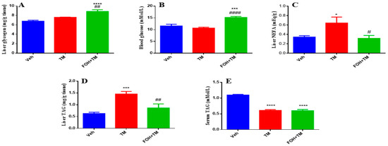 To evaluate the effects of FOH on TM-induced alterations in hepatic glycogen and triglyceride content, both serum and liver tissue samples were analyzed (Figure 7). Liver glycogen levels show no significant change following TM treatment, but FOH co-treatment restores glycogen content to baseline levels, indicating that FOH helps maintain glycogen storage in the face of potential metabolic disruptions. Similarly, blood glucose levels are not significantly altered by TM, though FOH co-treatment significantly reduces blood glucose, suggesting that FOH may have a regulating effect on glucose levels. Liver non-esterified fatty acids (NEFA) significantly increase in the TM-treated group, and FOH co-treatment significantly reduces these levels, indicating protection against lipid accumulation. Liver triglyceride (TAG) content increases significantly after TM treatment, and FOH co-treatment reduces TAG levels, indicating that FOH alleviates hepatic steatosis. Lastly, serum TAG levels are significantly elevated in the TM group and reduced by FOH, supporting the idea that FOH helps restore normal lipid metabolism. Overall, FOH effectively mitigates TM-induced metabolic disturbances by reducing lipid accumulation in the liver and serum, without significant effects on glycogen and blood glucose.