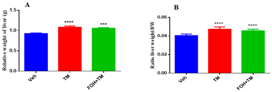 Lastly, our animal model showed no significant effects of FOH on body weight or fat tissue, suggesting that FOH protects against TM-induced liver dysfunction without altering overall body mass. This is consistent with previous studies [48,49] demonstrating FOH’s ability to protect against lipid accumulation in the liver, without affecting body weight or fat distribution.