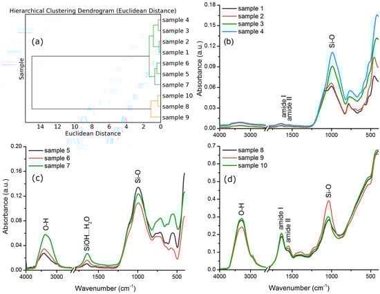 (a) Hierarchical clustering dendrogram of spectra calculated based on pairwise Euclidean distances. (b) ATR-FTIR spectra of samples 1–4. (c) ATR-FTIR spectra of samples 5–7. (d) ATR-FTIR spectra of samples 8–10.