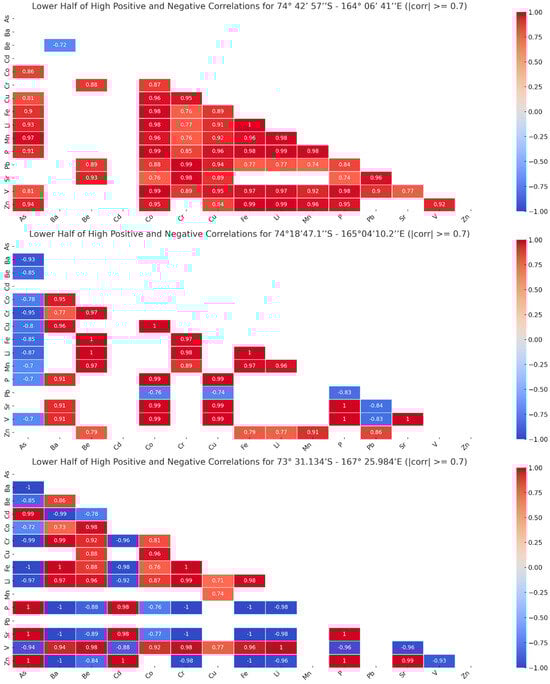 The lower half of high positive and negative correlations (the module of the correlation value is larger than or equal to 0.7) between the concentrations of elements in each station. The high positive correlations are represented in shades of red, while the high negative correlations are represented in shades of blue. Locations are identified based on their coordinates: Camp Faraglione—top plot; Edmonson Point—middle plot; Apostrophe Island—bottom plot.