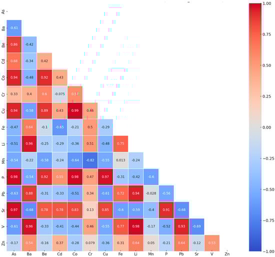 Lower half of the correlation matrix of element concentrations in samples from all collection points. The color scale used shows the maximum positive correlations (value of 1) in red and the maximum negative correlations (value of −1) in blue.