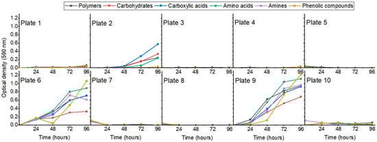 For each sample, 1 g was mixed in sterile conditions with 14 mL of liquid Amies media (Rmbio, Missoula, MT, USA), shaken at 200 rpm for 2 h at room temperature, left to settle for 10 min, and then the supernatant was inoculated on Biolog Ecoplates (Harvard, Cambridge, MA, USA), which are considered to be one of the most suitable methods for evaluating live bacterial community compositions [23,24], as we aimed to investigate viable cells only. The Biolog Ecoplates are 96-well plates that hold 31 carbon assays in triplicate, which are split into 6 groups: polymers, carbohydrates, carboxylic acids, amino acids, amines, and phenolic compounds. After inoculations, the plates were sealed with tape, incubated at 15 °C, and read for absorbance every 24 h at 590 nm (FlexStation Multimode Plate Reader, Molecular Devices, San Jose, CA, USA) for 96 h, according to the manufacturer. After 96 h, some wells developed completely (full substrate usage), while others presented no growth whatsoever.
