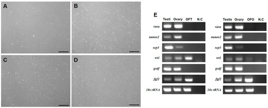 Morphology and characterization of olive flounder testicular cells (OFT) and olive flounder ovarian cells (OFO). (A) The representative image of OFT at passage 5. (B) The representative image of OFO at passage 5. (C) The representative image of OFT at passage 20. (D). The representative image of OFO at passage 20. (E) RT-PCR results from OFT and OFO at passage 30. Scale bar = 400 μm.