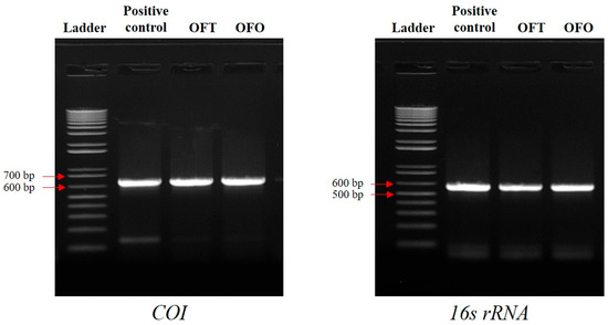 To identify the species of OFT and OFO, the cytochrome c oxidase subunit 1 (COI) and 16s rRNA region were amplified via PCR. As shown in Figure 2, COI amplification products of OFT and OFO were confirmed at 650 bp, which was the same size as in the positive control. Similarly, 16s rRNA amplification products of OFT and OFO were confirmed at 542 bp, and they showed the same size as in the positive control. In addition, the sequences of COI and 16s rRNA showed matches of 100% with the corresponding P. olivaceus sequences in GenBank (Supplementary Materials).