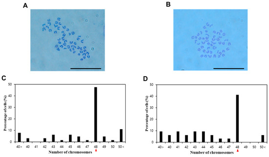 Karyotype analysis of OFT and OFO. Representative images of metaphase spreads from (A) OFT and (B) OFO. Normality test results (2n = 48) from (C) OFT and (D) OFO. Red arrowheads indicate the number of diploid P. olivaceus chromosomes. Scale bar = 20 μm.