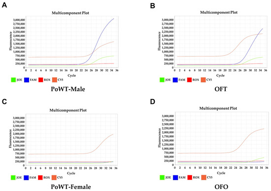 Sex identification analysis. The genetic sex of OFT and OFO was determined using SNP markers (5512T, 5227A, 8483C) by real-time PCR with validation by comparative analysis with wild-type P. olivaceus. (A) Male wild-type P. olivaceus. (B) OFT at passage 20. (C) Female wild-type P. olivaceus. (D) OFO at passage 20.
