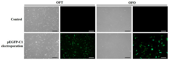 Transfection of green fluorescent protein expression vector into OFT and OFO cells. OFT and OFO were electroporated with the green fluorescent protein (GFP) expression vector pEGFP-C1. After electroporation, the two cell lines were cultured for 48 h and observed by fluorescent microscopy. Scale bar = 200 μm.