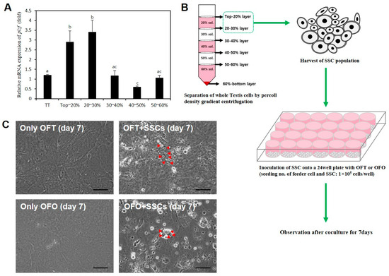 Evaluation of the enrichment of male GSCs via Percoll density gradient centrifugation. (A) Relative expression of plzf from each density fraction. abc Different letters indicate significant differences (p < 0.05). (B) Schematic representation of experimental procedures. Two different cell populations from the top–20% and 20–30% layers after Percoll density gradient centrifugation showed cell attachment after coculture for 7 days. (C) The representative images of coculture with GSCs or without. Scale bar = 50 μm.