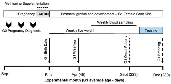 To investigate the effects of prenatal herbal methionine (Optimethionine®; Nuproxa, Queretaro, Mexico) supplementation during the last trimester of pregnancy on offspring growth, development, puberty onset, and first pregnancy, 60 multiparous pregnant purebred Alpine goats (G0) with at least three parities and their female progeny (doelings; G1; n = 38) from the university pen-raised herd were included in the experiment. G0 dams were assigned to either a control group (CTL-G0; no methionine) or a treatment group (H-MET-G0; herbal methionine). Blocking was done at enrollment based on gestational age (100 ± 0.5 days) and body weight (50.4 ± 6.6 kg). Management of the dams (G0) and newborns (G1) at birth and up to weaning was previously reported [31].