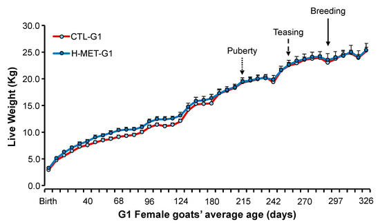 As previously described [31], gender, live weight, and litter size were recorded at birth. From birth to weaning (45 d), G1 goat kids were vaccinated with Clostri-10® (Lapisa. La Piedad, Mexico). Male G1 kids were sold at weaning, and only female G1 kids (n = 38) were retained for the next phase of the experiment. Female G1 kids were housed together in a single pen and fed the diet described in Table 1. To assess female progeny growth (CTL-G1: n = 21; H-MET-G1: n = 17), live weights were recorded weekly from birth until the first breeding (9 months of age; Figure 2) using a mobile scale with a 200 kg capacity and a precision of 0.05 kg (Torey®).