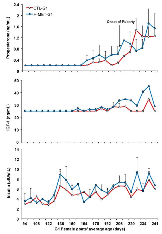 Plasma concentration of progesterone, IGF-1, and insulin of G1 doelings born to dams that received methionine supplementation (Optimethione®; H-MET-G0) or not (CTL-G0) during the last trimester of pregnancy. The black arrow indicates the onset of puberty. IGF-1 and insulin data represent pooled samples.