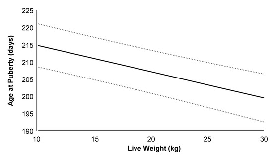 The age of puberty was determined based on the criteria established by Zarazaga et al. [40] and Espinoza-Flores et al. [41], whereby puberty was defined as the presence of plasma progesterone concentration ≥0.5 ng/mL in two consecutive blood samples. The live weight recorded closest to this date was considered the live weight at puberty. Weekly plasma progesterone concentrations (see details below) were measured using an automated IMMULITE® 1000 progesterone immunoassay kit (catalog number LKPW1; Siemens Healthcare, New York, NY, USA). It had a calibration range of 0.20 to 40 ng/mL and a sensitivity of 0.46 ng/mL.