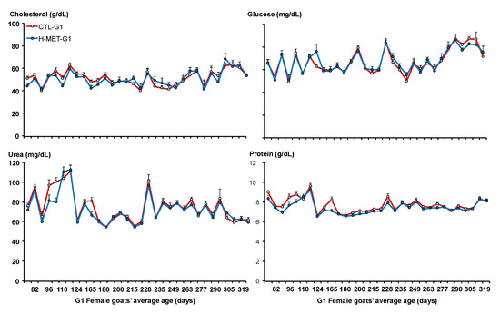 Plasma concentrations of cholesterol, glucose, urea, and protein of G1 doelings born to dams that received methionine supplementation (Optimethione®; H-MET-G0) or not (CTL-G0) during the last trimester of pregnancy.